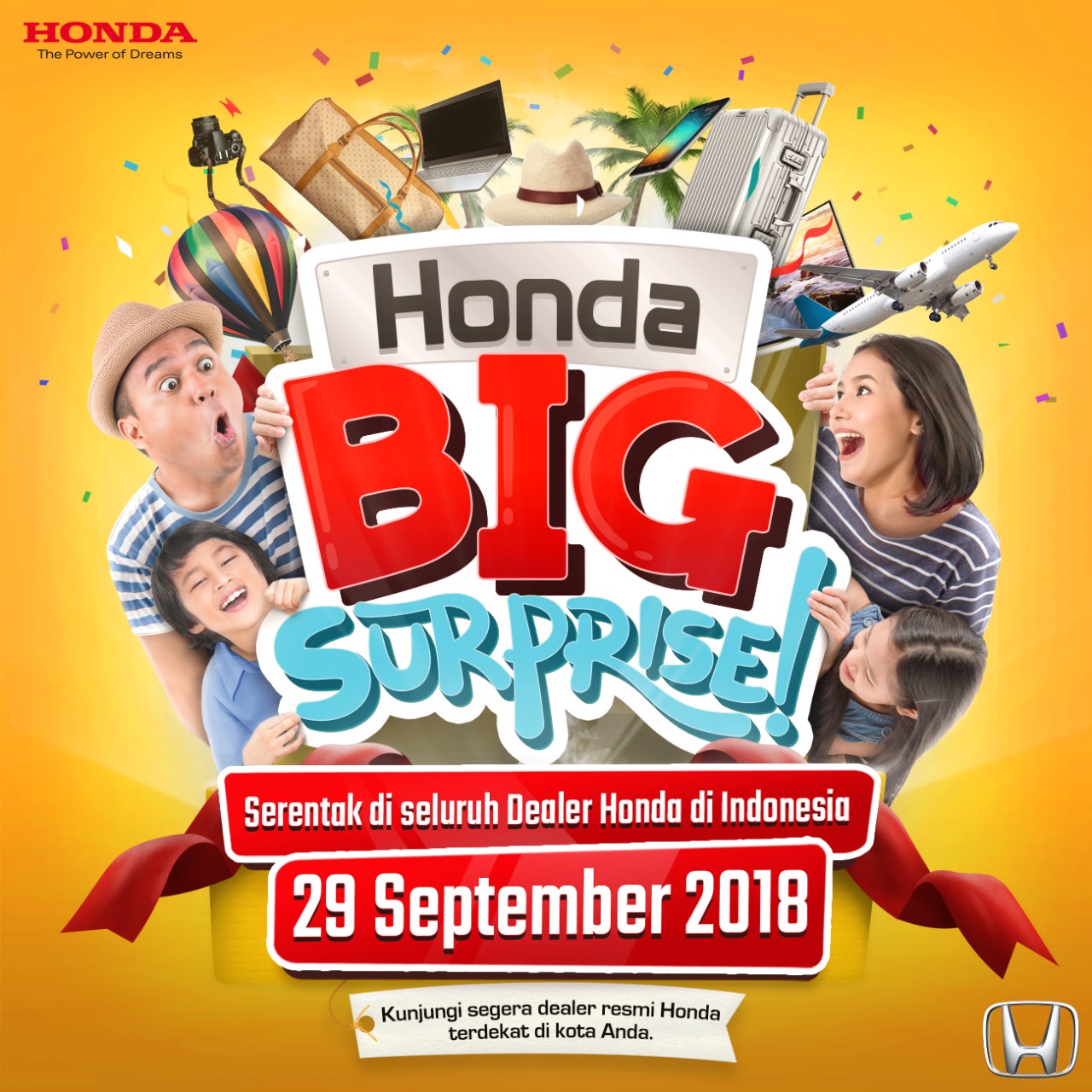 Acara showroom event untuk program “Honda Big Surprise” yang pertama akan digelar secara serentak di seluruh dealer Honda di Indonesia pada tanggal 29 September 2018. Sementara jadwal untuk showroom event berikutnya dapat dilihat di website www.honda-indonesia.com.